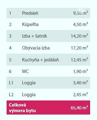 Rozloha nehnutelnosti je 65,40m vrátane loggií.