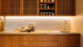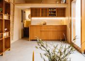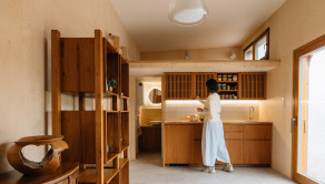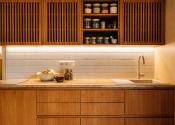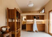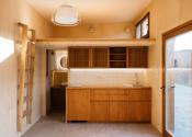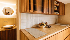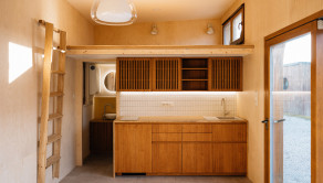 Vstupný priestor do domu otvárajú nadštandardné, presklenné, posuvné dvere , širšie o 1,3 m ako je klasický rozmer. Vkročením do tohoto éterického priestoru Vás milo prekvapí jeho priestrannosť, prírodná vôňa dreva a precítenosť dennej pracovnej časti , ktorej súčasťou je obývacia izba s kuchyňou. DOMINANTOU centrálnej miestnosti - je atypické kruhové okno a inšpiratívne oblúkové kúty z brezovej preglejky , ktorá je použitá ako vnútorný obklad v celom objekte. Veľmi príjemnú atmosferu tu vytvára aj pohodlná sedačka a nábytok z mangového dreva. Kuchyňa je ladená do prepracovaného Japonského štýlu , kde bola použitá dubová dýha. Má vytvorený praktický extra úložný priestor nad linkou s LED osvetlením. Elektrická varná doska, dres a batéria sú zabudované do pracovnej dosky z prírodného dubového dreva.
