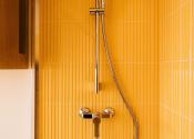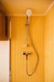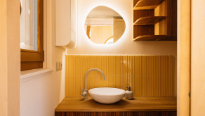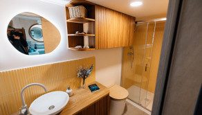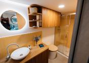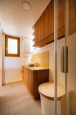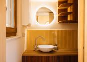 Kúpelňa s WC sú prakticky umiestnené za kuchynskou linkou, kde majú samostatný separé priestor . Ich súčasťou je priestranný sprchový kút s dizajnovým obkladom . Drevenná komoda s kruhovým umývadlom a dizajnové podsvietené zrkadlo vytvárajú príjemnú relaxačnú atmosféru v tomto priestore a skvostne ladia k Japonskému minimalistickému dizajnu v kuchyni.. WC- BIOBOBO/ separačná toaleta/ súčasťou je aj predpríprava na klasickú toaletu.Vo vrchnej skrinke je zabudovaný elektrický ohrievač vody.