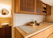LOFT - spací priestor je situovaný ponad kuchynskú linku , je sprístupnený dubovým masívnym rebríkom s koľajnicou a bočným uchytom na odloženie. Na odvetrávanie spacieho kútika Vám poslúži posuvné a štandartne sklopné okno.