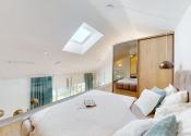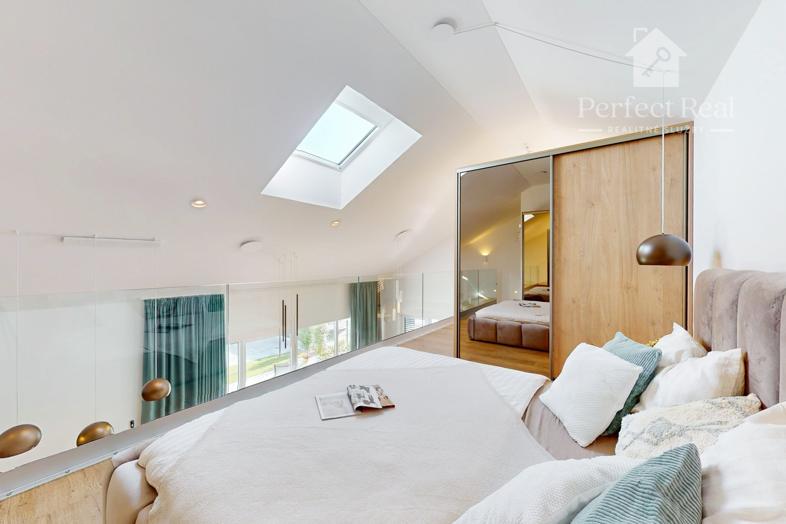Spálňa s nadčasovou posteľou a výhľadom na nočnú oblohu cez strešné okno , vytvára príjemné miesto na relax a odpočinok.
