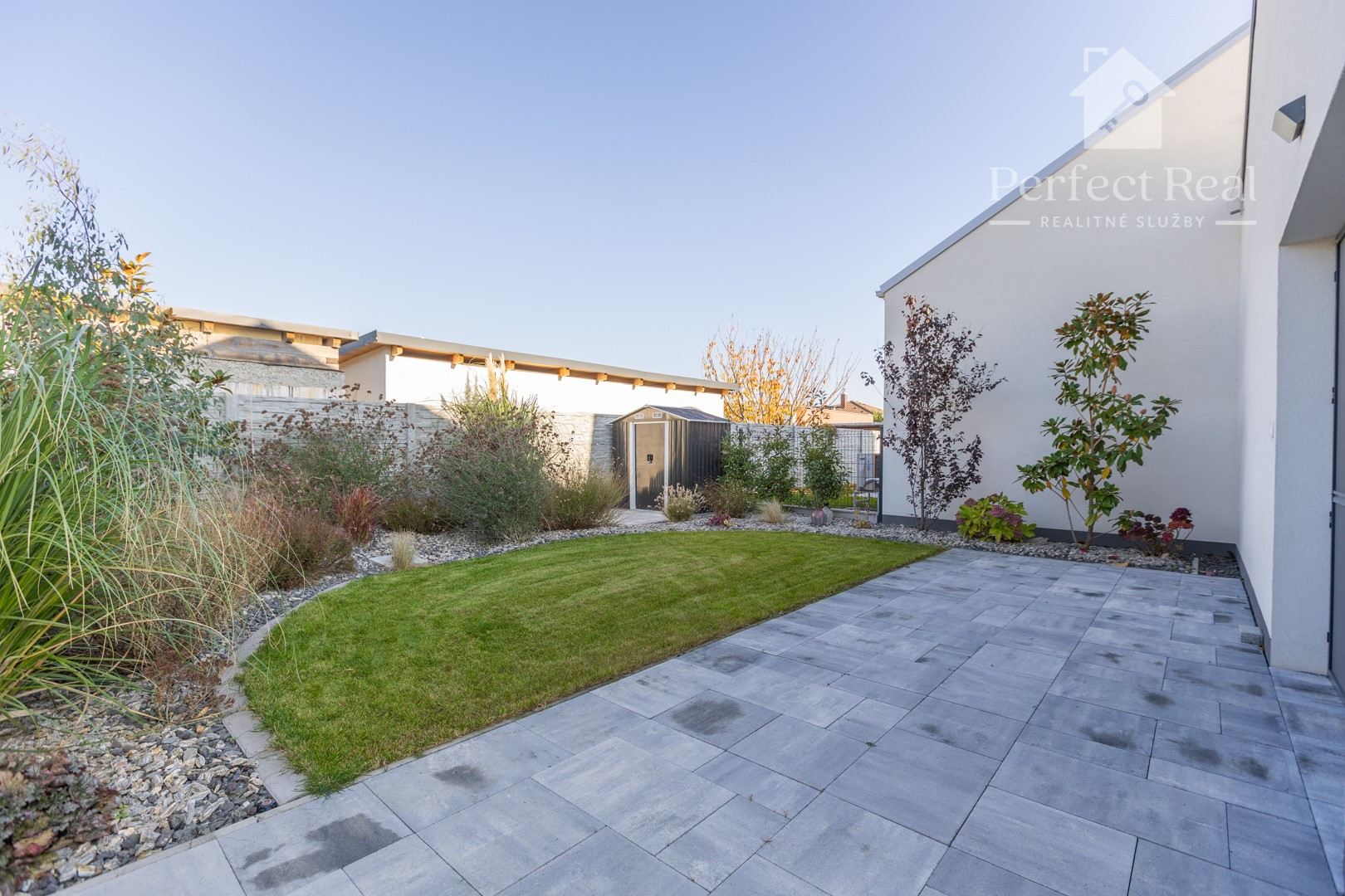 Záhradný domček je jej súčasťou , dotvára praktickú atmosféru priestoru.