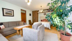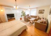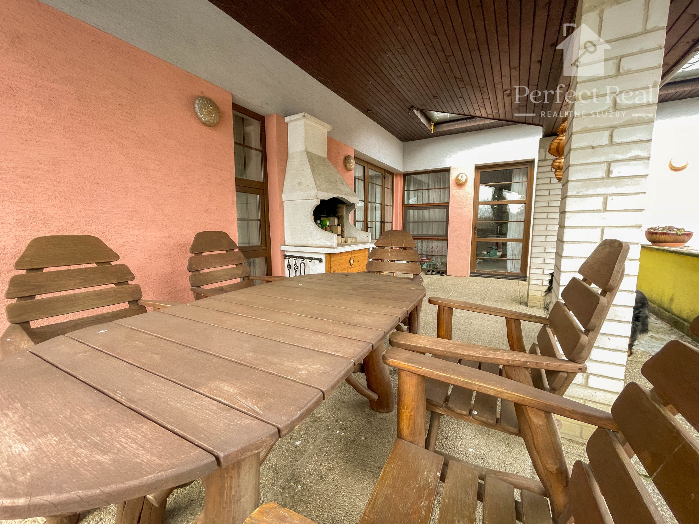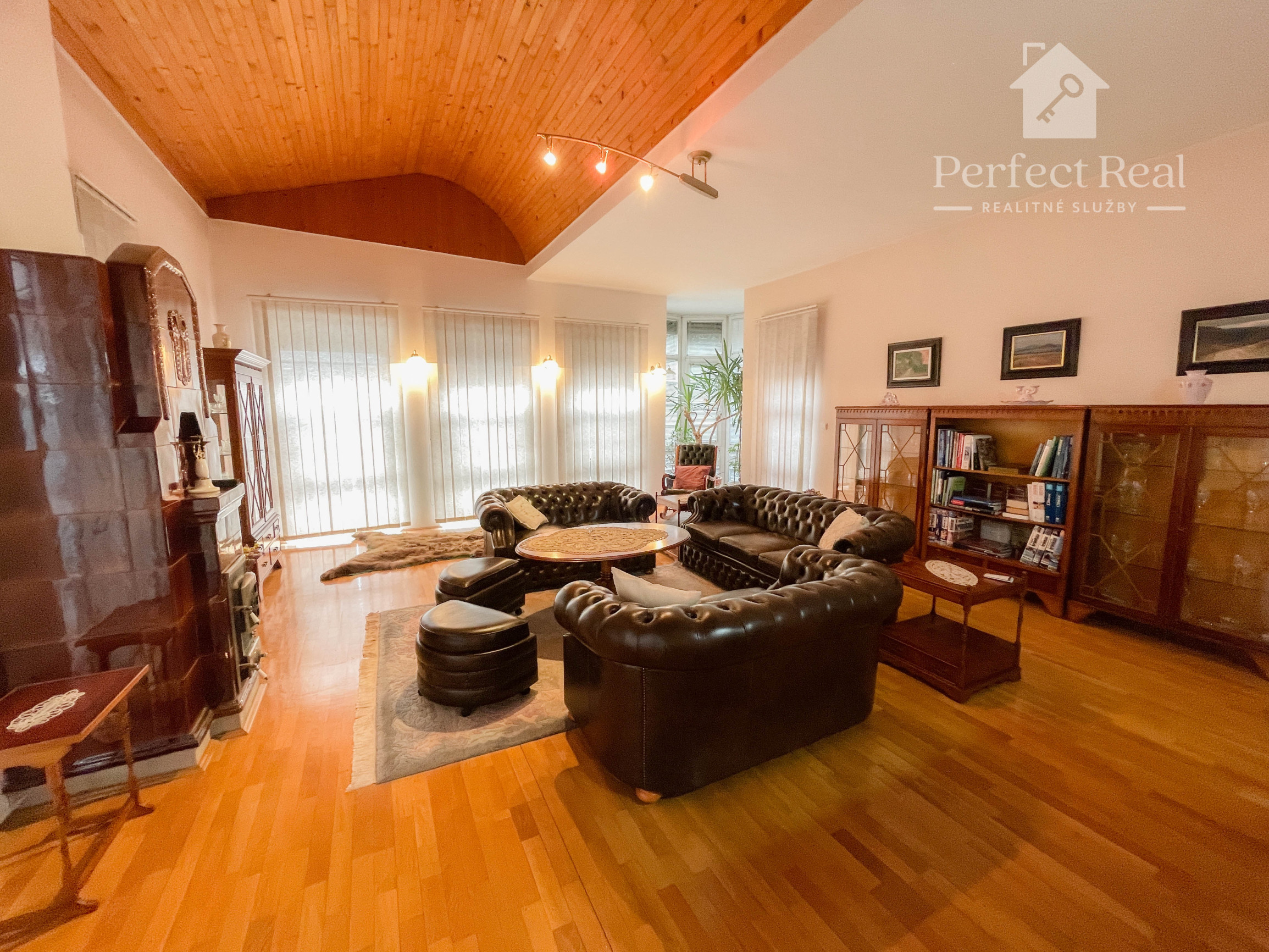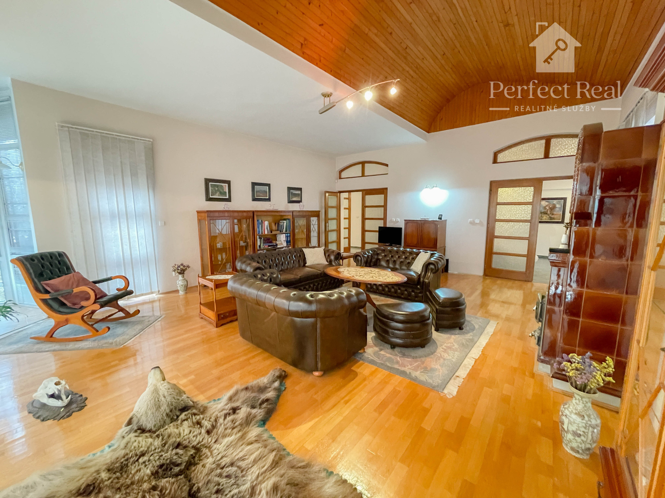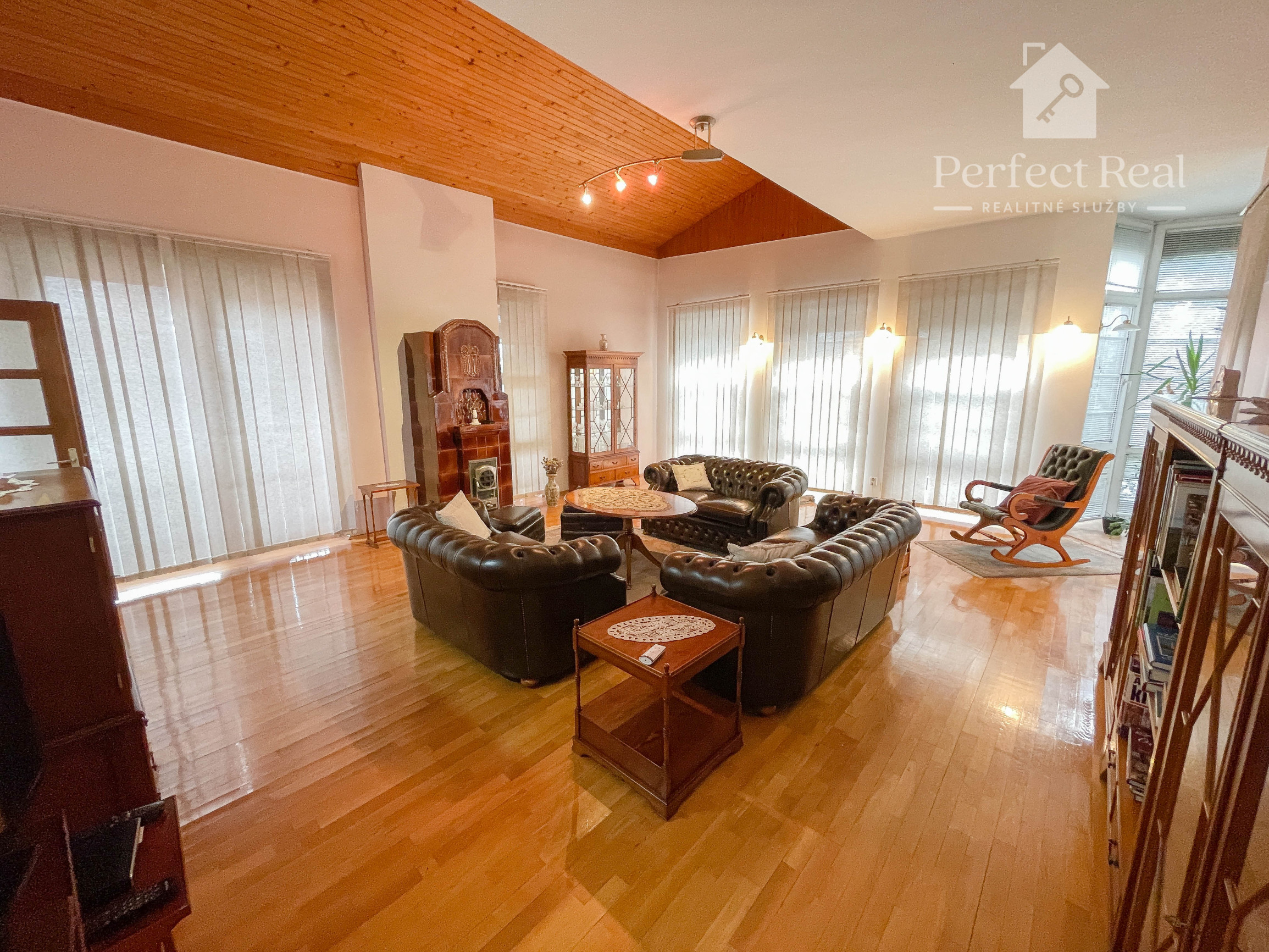 priestranná obývacia izba s krbovými kachľami a výstupom na terasu