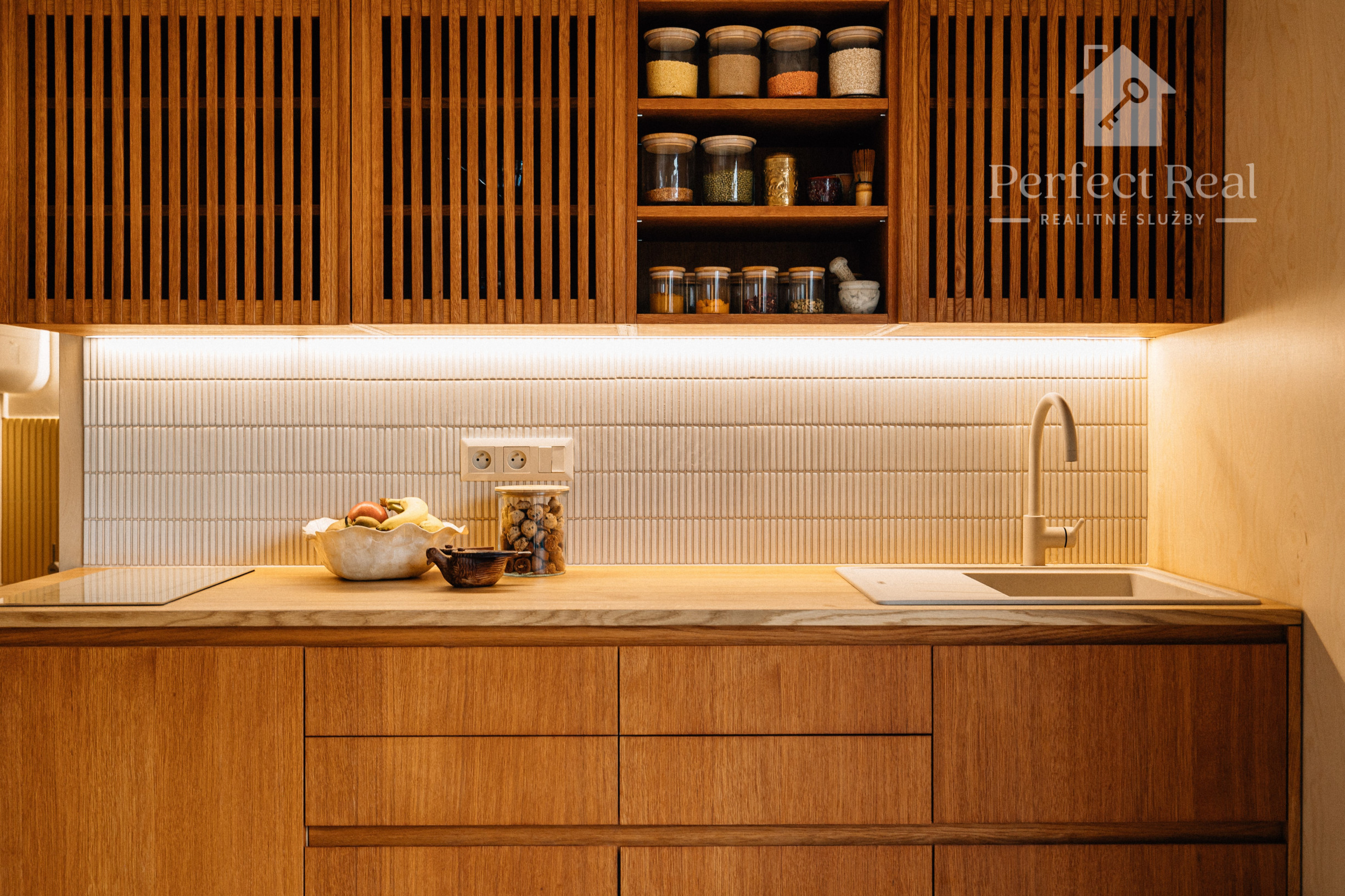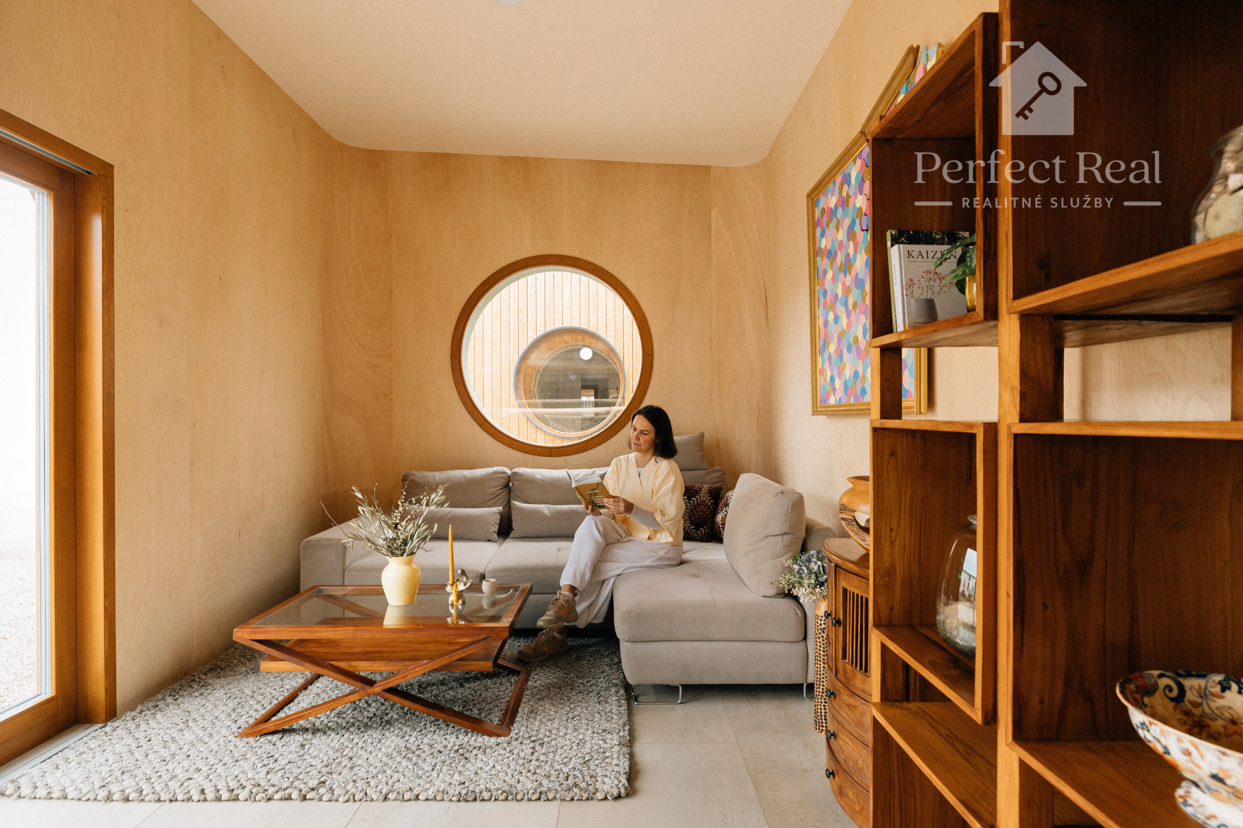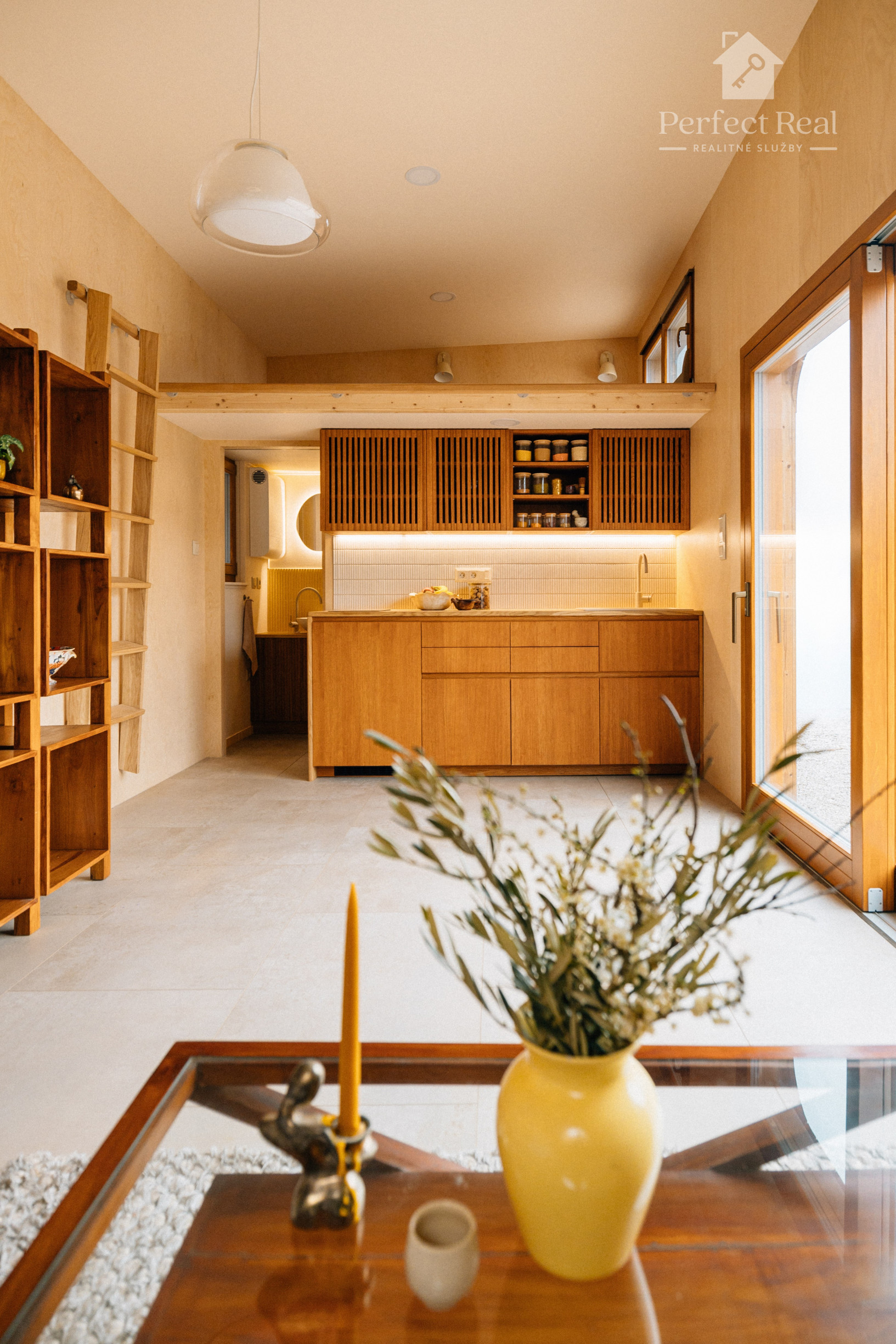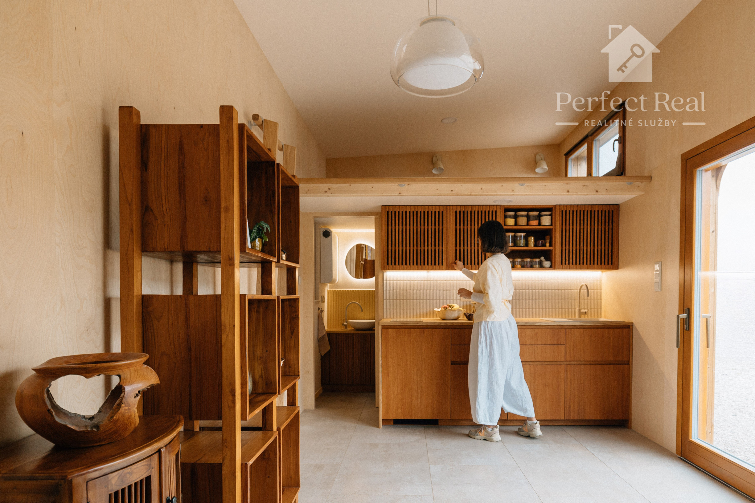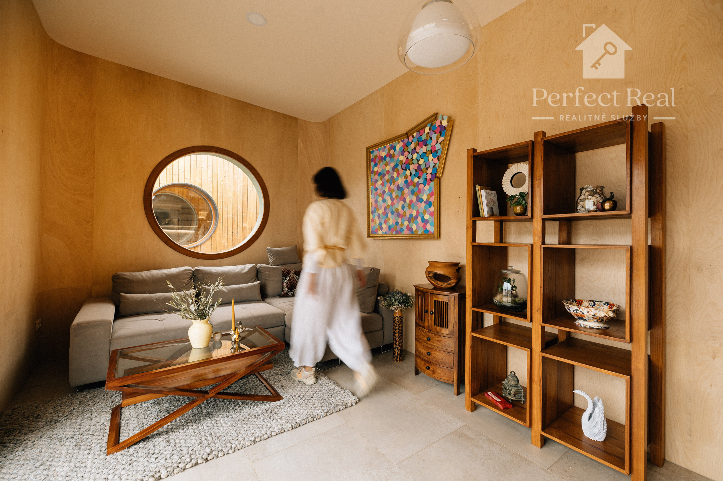 Vstupný priestor do domu otvárajú nadštandardné, presklenné, posuvné dvere , širšie o 1,3 m ako je klasický rozmer. Vkročením do tohoto éterického priestoru Vás milo prekvapí jeho priestrannosť, prírodná vôňa dreva a precítenosť dennej pracovnej časti , ktorej súčasťou je obývacia izba s kuchyňou. DOMINANTOU centrálnej miestnosti - je atypické kruhové okno a inšpiratívne oblúkové kúty z brezovej preglejky , ktorá je použitá ako vnútorný obklad v celom objekte. Veľmi príjemnú atmosferu tu vytvára aj pohodlná sedačka a nábytok z mangového dreva. Kuchyňa je ladená do prepracovaného Japonského štýlu , kde bola použitá dubová dýha. Má vytvorený praktický extra úložný priestor nad linkou s LED osvetlením. Elektrická varná doska, dres a batéria sú zabudované do pracovnej dosky z prírodného dubového dreva.