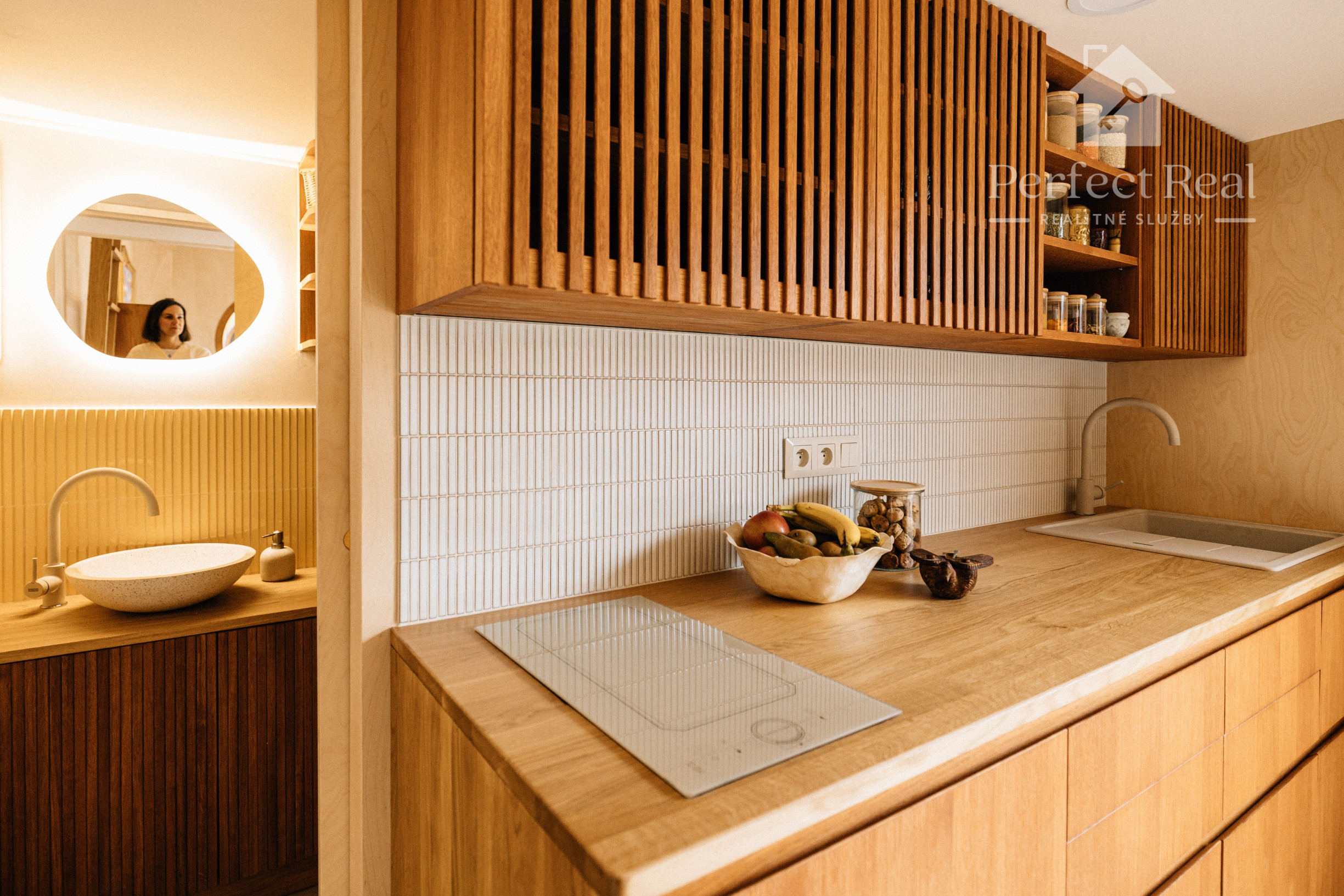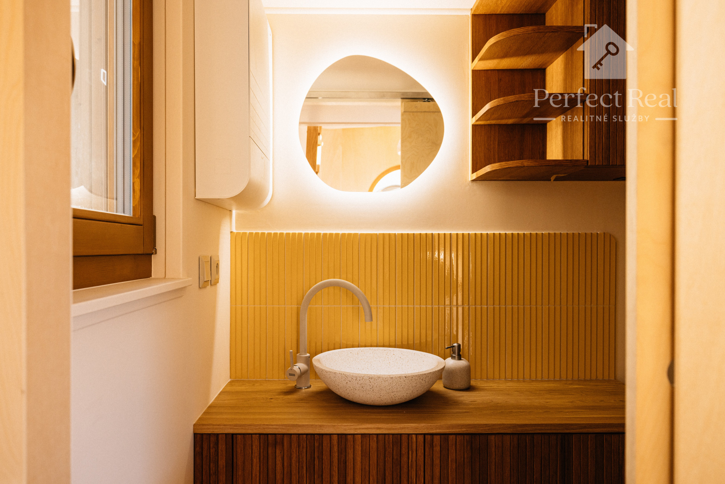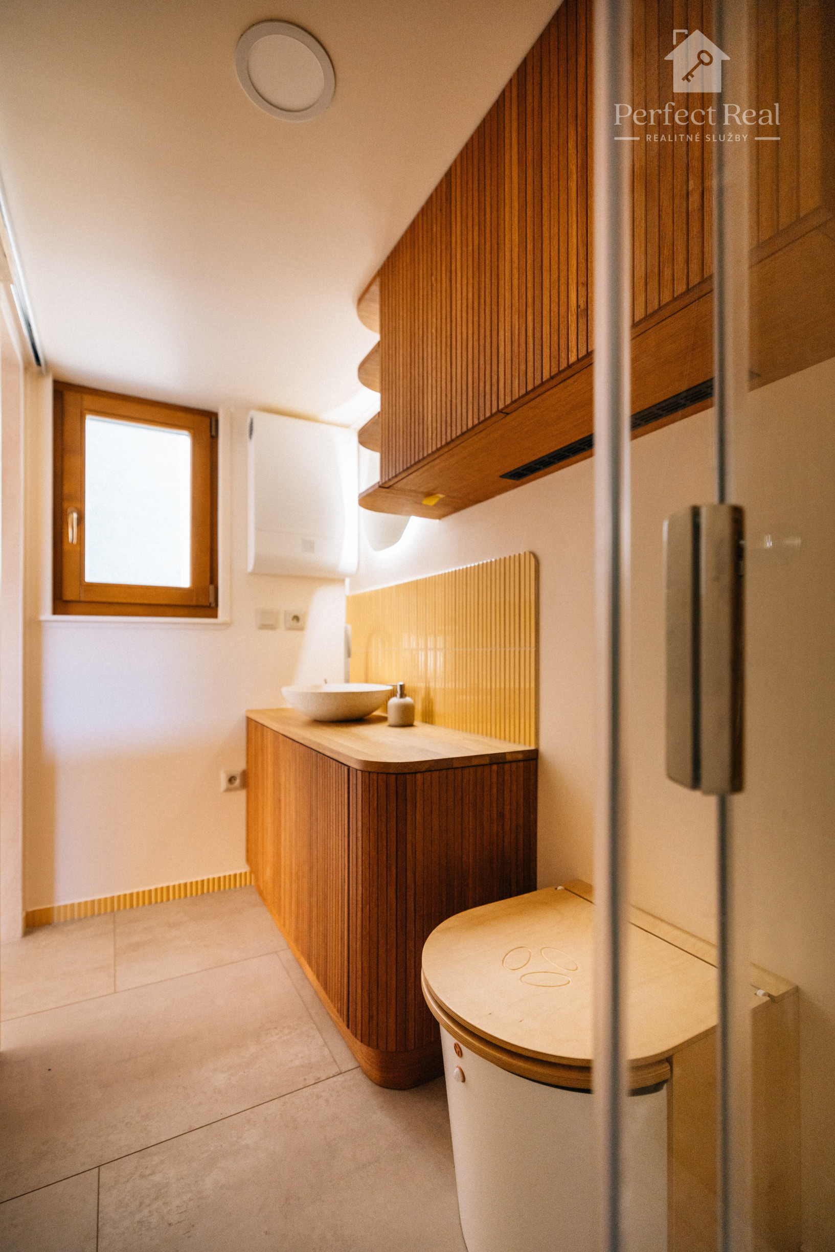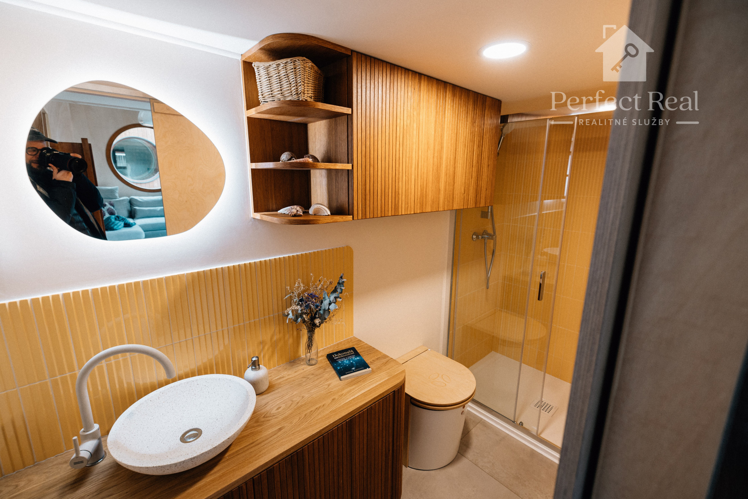 Kúpelňa s WC sú prakticky umiestnené za kuchynskou linkou, kde majú samostatný separé priestor . Ich súčasťou je priestranný sprchový kút s dizajnovým obkladom . Drevenná komoda s kruhovým umývadlom a dizajnové podsvietené zrkadlo vytvárajú príjemnú relaxačnú atmosféru v tomto priestore a skvostne ladia k Japonskému minimalistickému dizajnu v kuchyni.. WC- BIOBOBO/ separačná toaleta/ súčasťou je aj predpríprava na klasickú toaletu.Vo vrchnej skrinke je zabudovaný elektrický ohrievač vody.