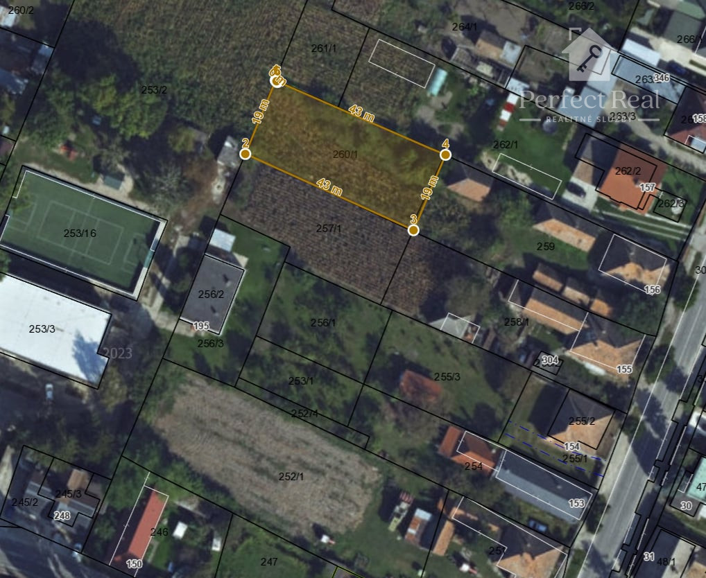 Pozemok je vedený na liste vlastníctva ako záhrada, má 8 árov, írku 19 m a dĺžku 43 m.