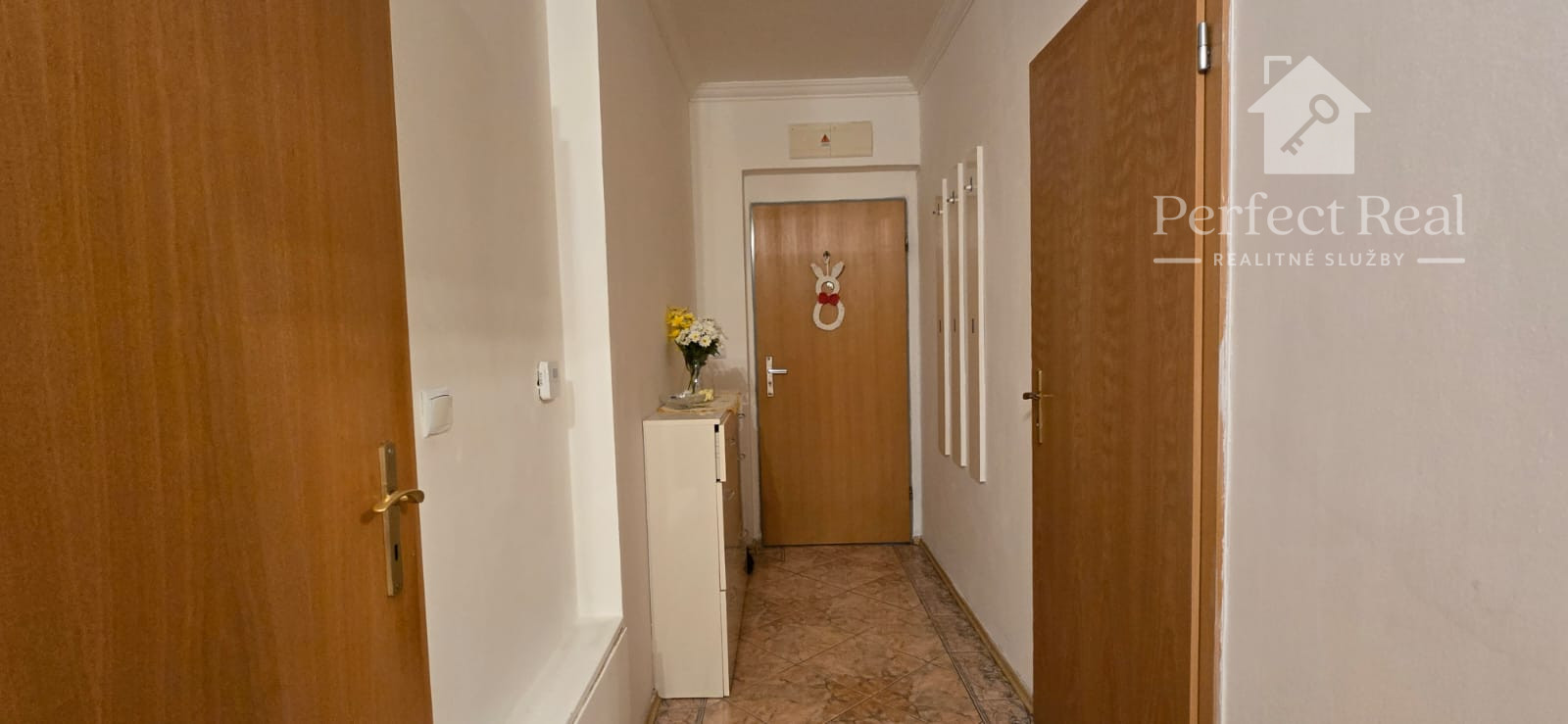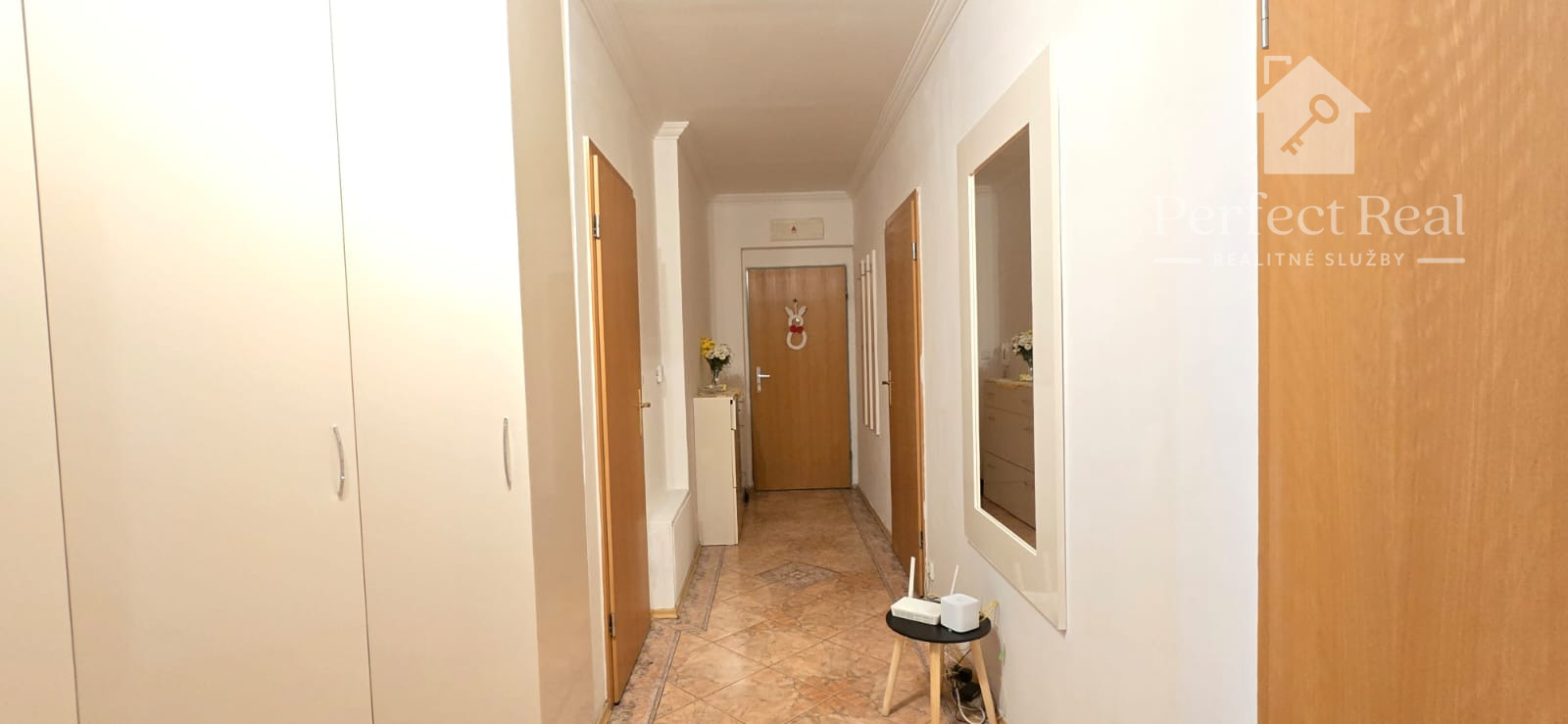Podlahy sú keramické, okná sú plastové s vonkajšími žalúziami, interiérové a vchodové dvere sú drevené. V byte sa nachádzajú dve veľké vstavané skrine (v hale a v jednej spálni).